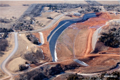 Canton Dam was constructed in 1948. When it became necessary to increase spillway discharge capacity to pass the Probable Maximum Flood (PMF), USACE decided to construct an auxiliary spillway through the right abutment. The structure measures 68 feet tall and 15,140 feet long at its crest with a maximum storage capacity of 383,000 acre-feet.