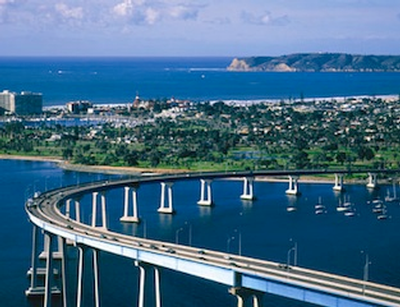 The curved, five-lane 11,179-foot-long prestressed concrete/steel girder structure connects the cities of Coronado and San Diego over the San Diego Bay. It reaches a maximum height of 200 feet, allowing the U.S. Navy ships that operate out of the nearby Naval Station San Diego to pass underneath.